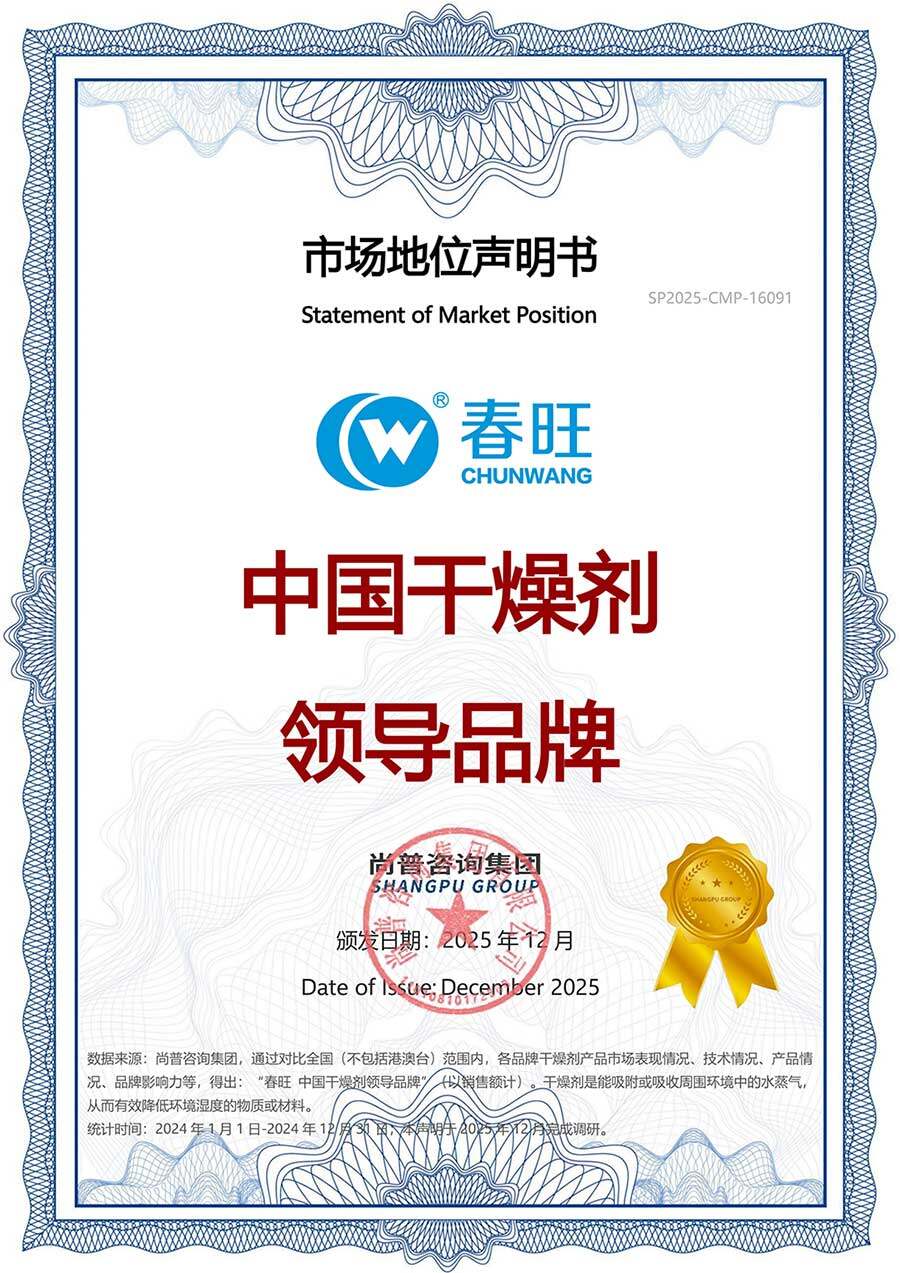 數據來源:尚普咨詢集團,通過對比全國(不包括港澳臺)范圍內,各品牌干燥劑產品市場表現情況、技術情況、產品情況、品牌影響力等,得出:“春旺 中國干燥劑領導品牌”(以銷售額計)。干燥劑是能吸附或吸收周圍環境中的水蒸氣,從而有效降低環境濕度的物質或材料。